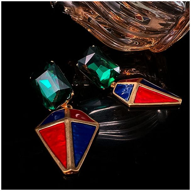 Integrating enamel into simple geometric shapes and connecting them with green zircon diamonds on the top, the overall design reflects the vintage style of the 1990s.